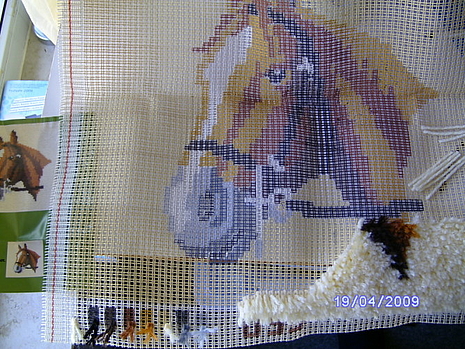 Am einfachsten ist es, nach einer farbigen Vorlage auf Stramin und den passenden zugeschnittenen Fäden zu arbeiten. Diese Packungen gibt es fertig zu kaufen als Kissen, Wandbehang, Teppich, Badvorleger ... usw.